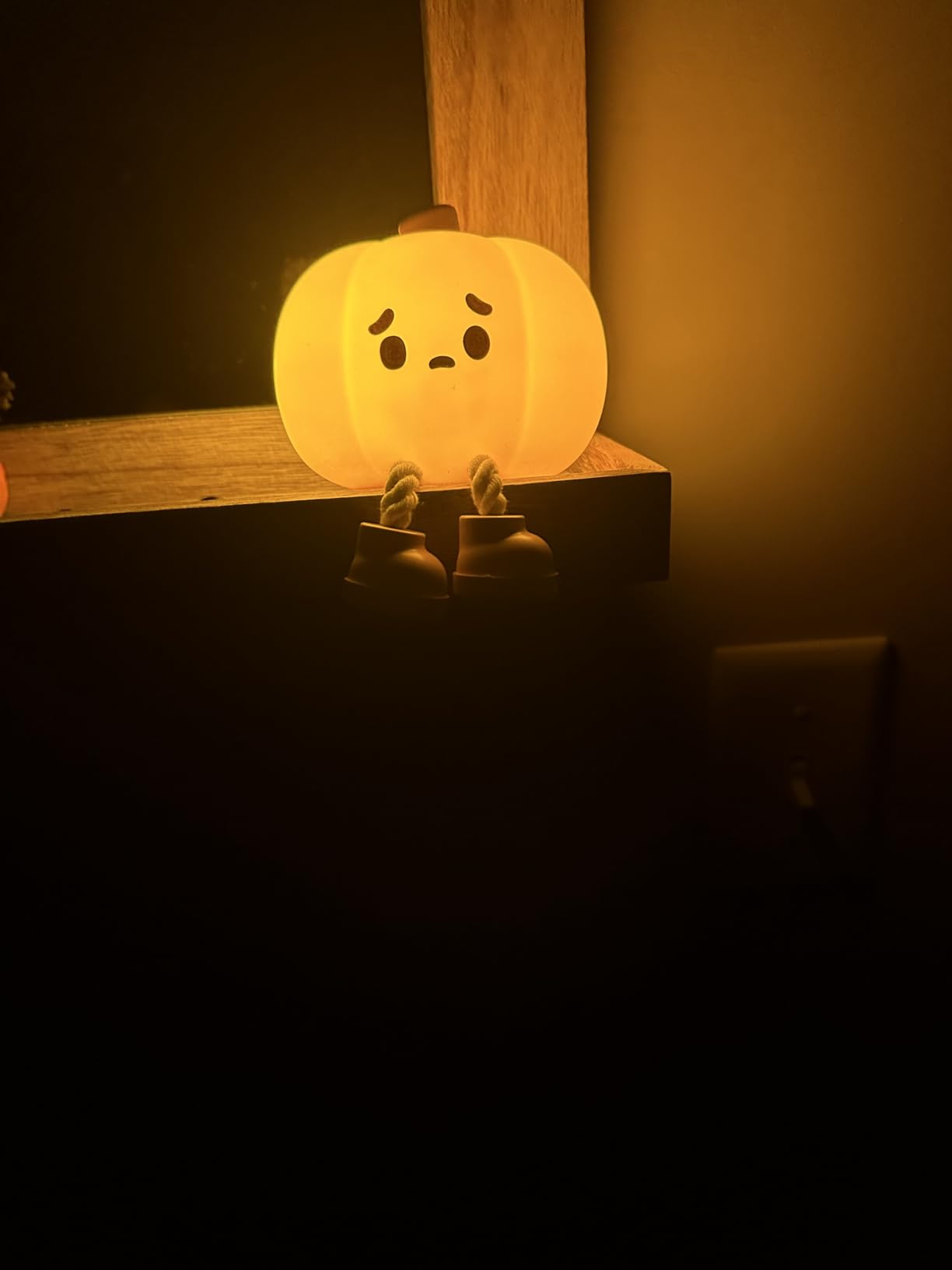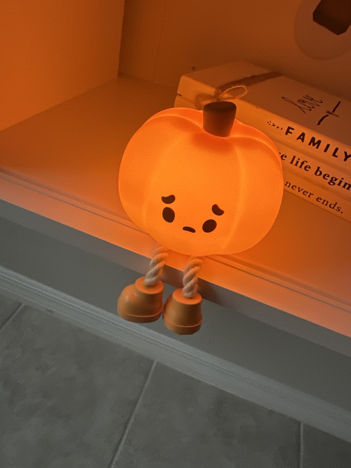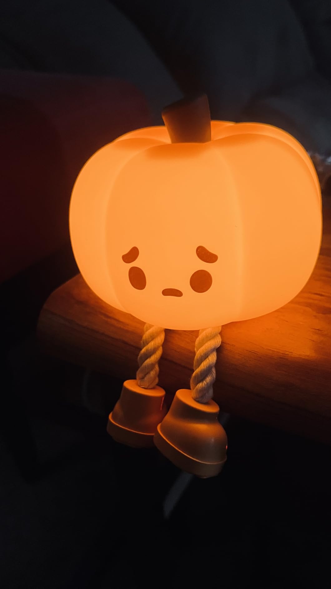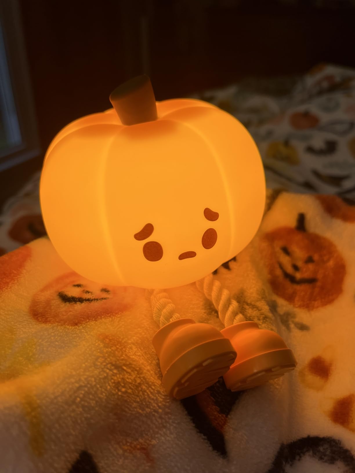 I bought this as a Halloween decoration, but now it stays on my nightstand year-round. The glow is warm and cozy, and it lasts all night after charging.